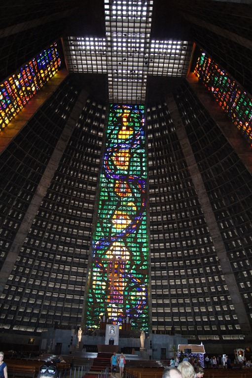 A nap hátralévő részében több helyen is megállva buszos városnézést tartottunk. A közeledő 2014-es foci VB és 2016-os olimpia miatt már több helyen felújítások, építkezések zajlanak. Felújítás alatt áll a Maracana stadion is. A város építészetileg nem igazán egységes. Néhány klasszikus épület mellett beton kolosszusok, csupa-üveg irodaházak, lepukkant panelek akár egymás szomszédságában is megtalálhatók. Sok lepukkant épület tetőtől talpig (akár a 10. emeletig is) graffitis firkákkal „díszített”. Láttuk a karnevál helyszínét, ami gyakorlatilag hosszú sor lelátó betonból, amit a karneválon kívül semmi másra nem használnak. Üresen nem volt egy felemelő látvány. A nagy katedrális szintén főként beton építmény, modern épület az irodákkal teli városközpont szívében. Érdekes, nem mindennapi látvány.