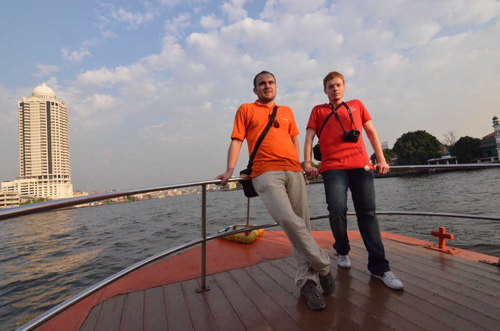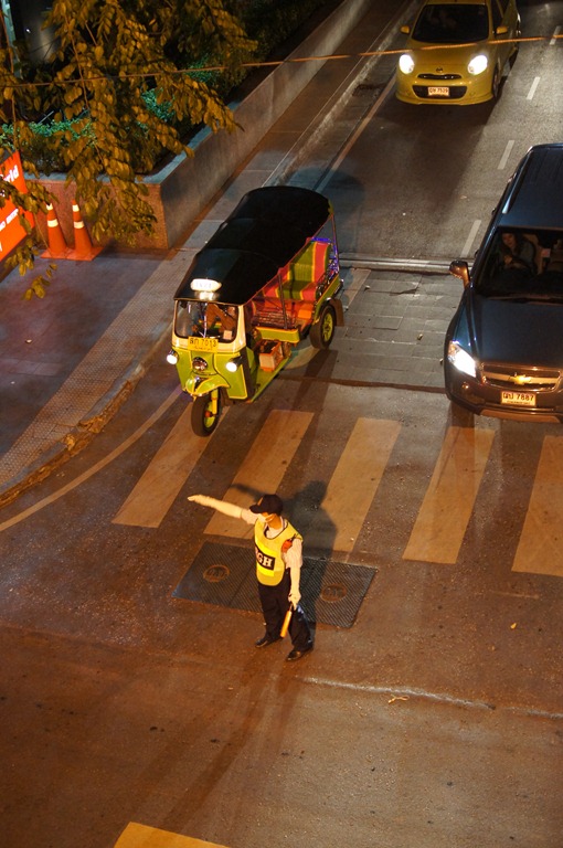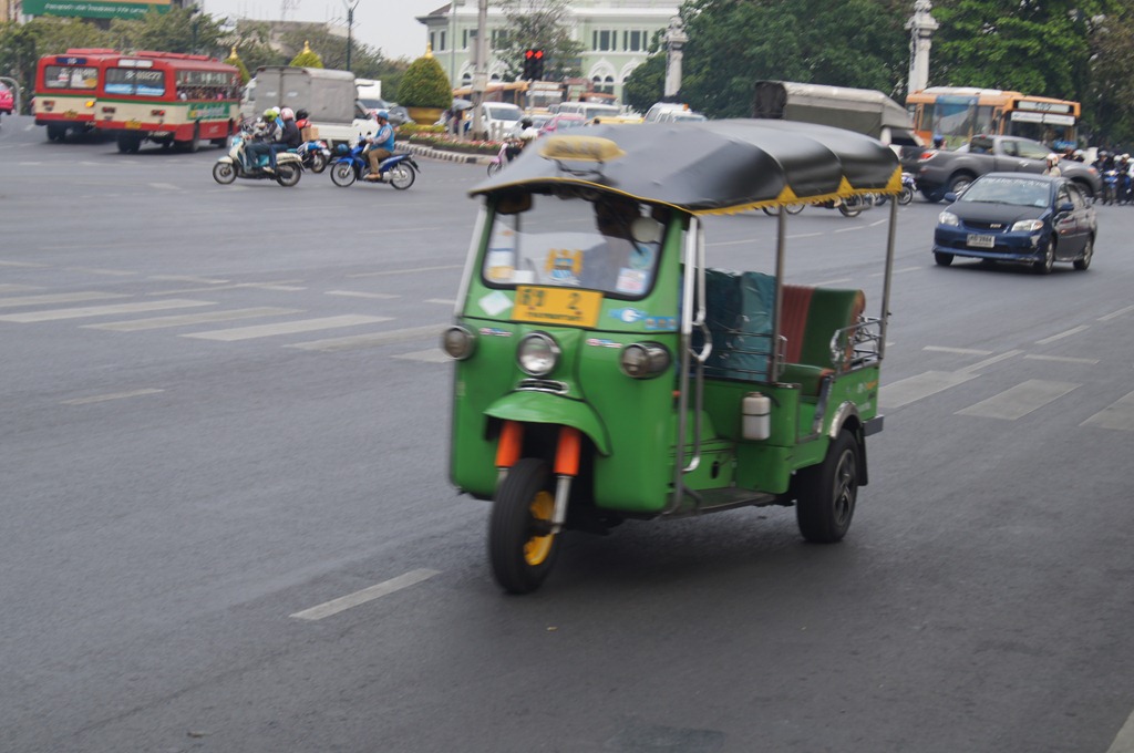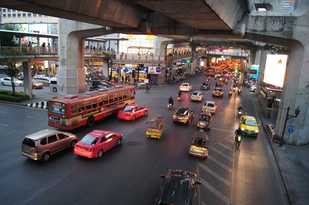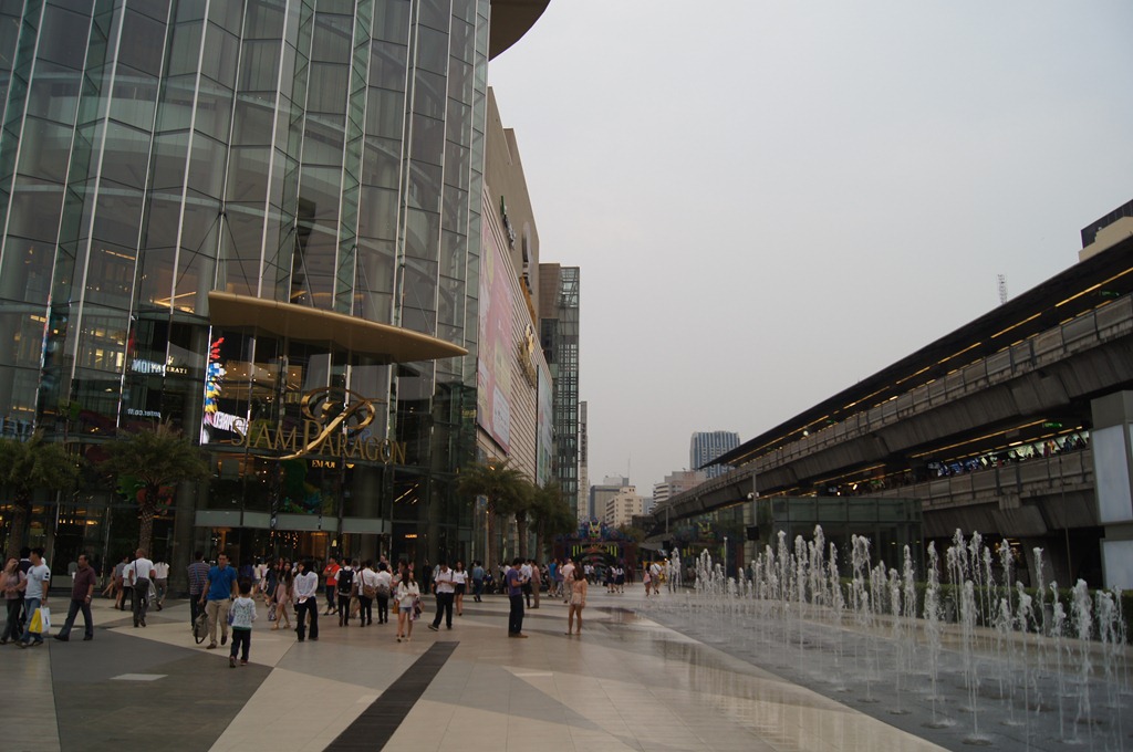 Bár nagyon fáradtak voltunk, a 6 órás időeltolódás okozta jetlag leküzdése érdekében úgy döntöttünk, hogy csak sötétben alszunk, így valamilyen, ilyen fáradtan is befogadható célpontot kerestünk. A szállodánktól mindössze pár sky train megállónyira található, a Siam nevű állomás környékén, bevásárló központtokkal telirakott negyedbe indultunk. Olvastuk, hogy Bangkok a GIGA méretű plázák városa is, de amíg nem látom nem tudom elképzelni. 1-2 ilyen bevásárlóközpont, amelyekben jártunk akkora, hogy egyik budapesti társához sem hasonlítható. Bennük a nálunk is megszokott pláza termékeken kívül, autószalonok (pl.: Maserati, Rolls-Royce, stb), elektronikai áruházak végtelen mennyiségű kütyüvel, meg amit az ember el tud képzelni, minden kapható. Az épületek között végeláthatatlan autó sorok, bugyirózsaszín taxikkal, és tuktukokkal (3 kerekű, motoros riksa).