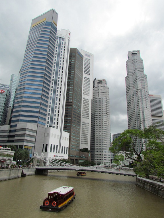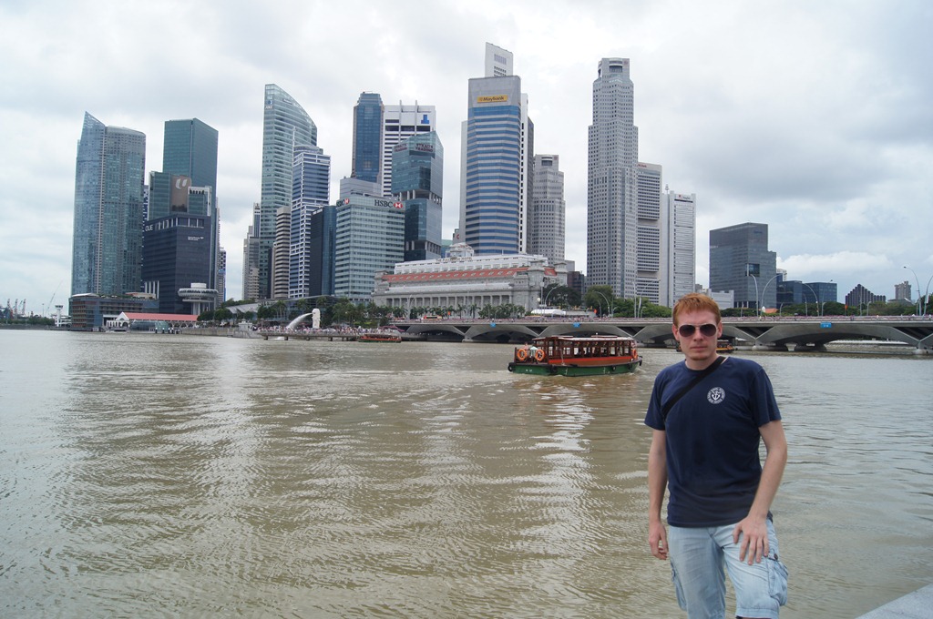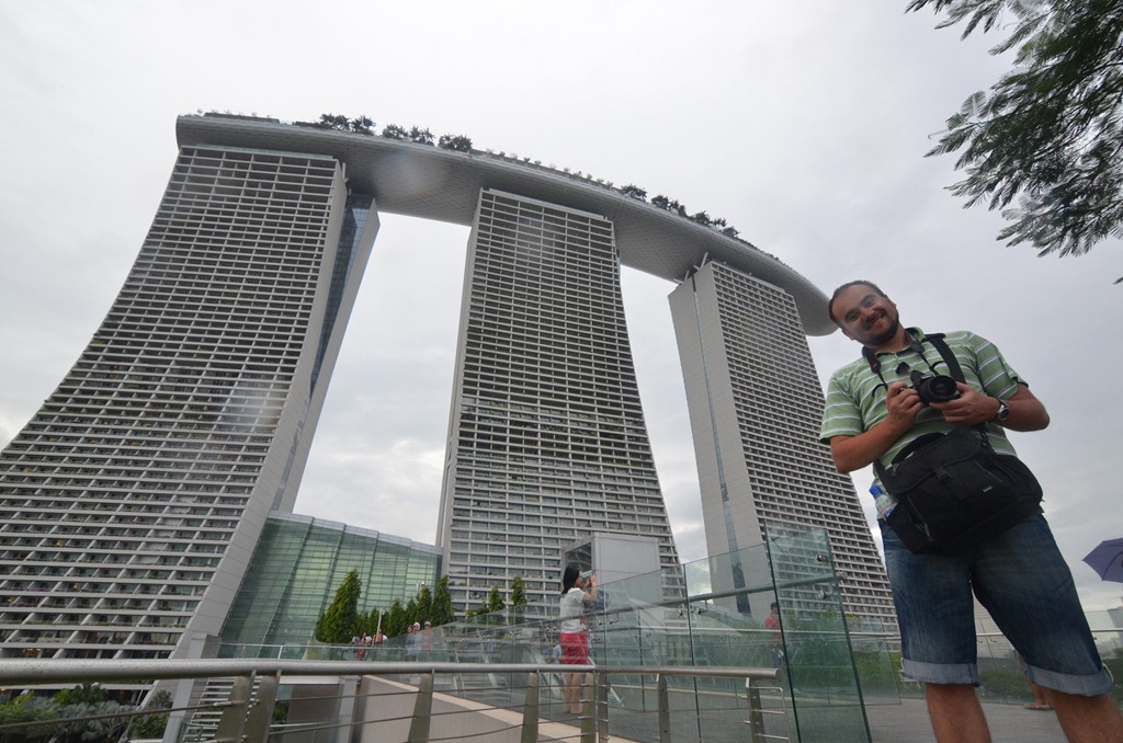 Miután leértünk megérkezett a Szingapúrban általános minden napi eső is, ez remek alkalmat adott egy kicsit megkésett ebédhez. A mindennapos esőnek köszönhetően egyébként Szingapúrban minden zöld terület valószínűtlenül zöld. Szerencsére ez esetben sem sokáig, sem pedig nagyon nem esett, így folytathattuk a nézelődést ezúttal már a híd túl partján, a Marina Bay Sands hotel lábánál.