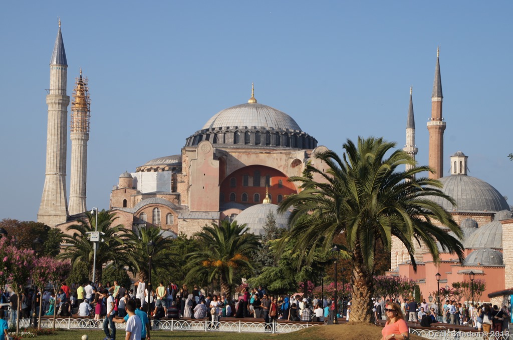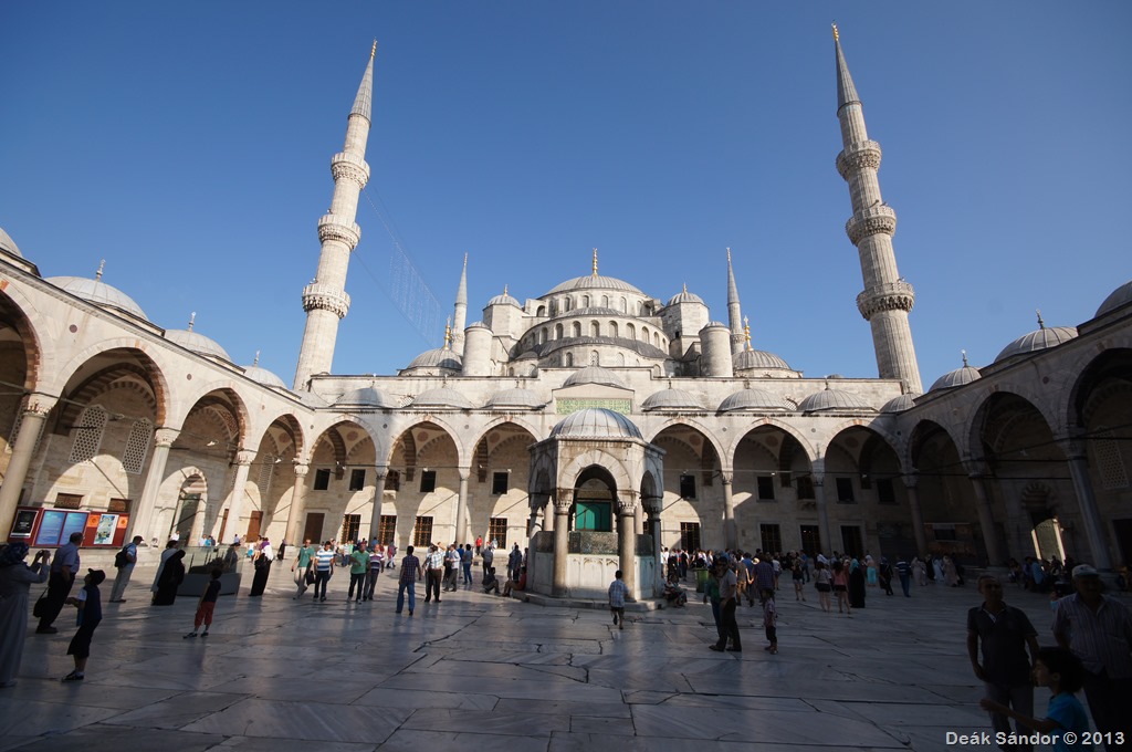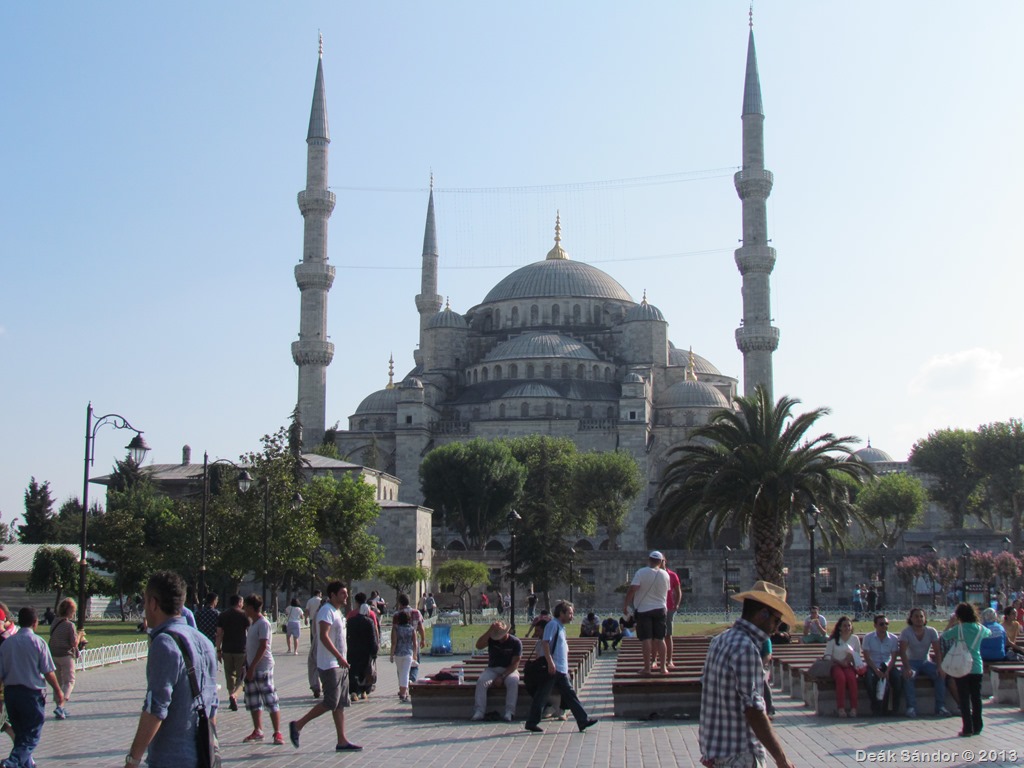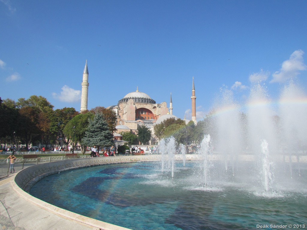 Délután maradt még időnk egy kis sétára. Pénz váltás után a Sultanahmet térre mentünk ahol az egyik irányban a Kék Mecset, másikban az Ayasofia (Hagia Sofia) hatalmasodik.