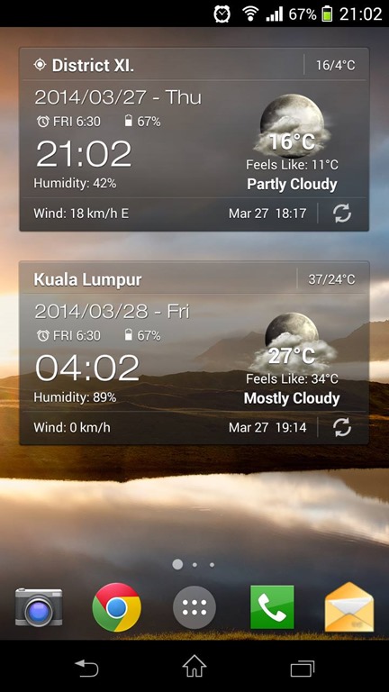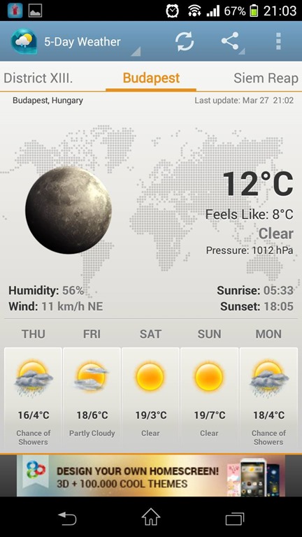 Itthon is, de utazás közben különösen jó tudni, hogy milyen idő vár ránk a következő napokban, és ennek megfelelően milyen programot tervezhetünk, hogy kell felöltöznünk. Persze rengeteg időjárás előrejelző alkalmazás van minden platformra, én mégis azért szeretem ezt, mert az időjárás mellett a választott település helyi idejét is mutatja. Ha távoli helyekre utazunk érdekes lehet nem csak a helyi, hanem az otthoni idő is, amit nem minden telefonon egyszerű egy ilyen jó kis widget nélkül előbányászni.